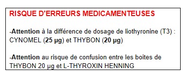 Actualisation du 18/11/2025Une étiquette en français alertant sur un risque d’erreurs médicamenteuses était jusqu’à maintenant apposée sur les sachets de Thybon remis aux patients par les pharmaciens, en attendant de pouvoir l’apposer sur les boites directement.À partir de mi-novembre 2025, une étiquette « Risque d’erreurs médicamenteuses » est apposée directement sur les nouvelles boîtes de Thybon pour rappeler :