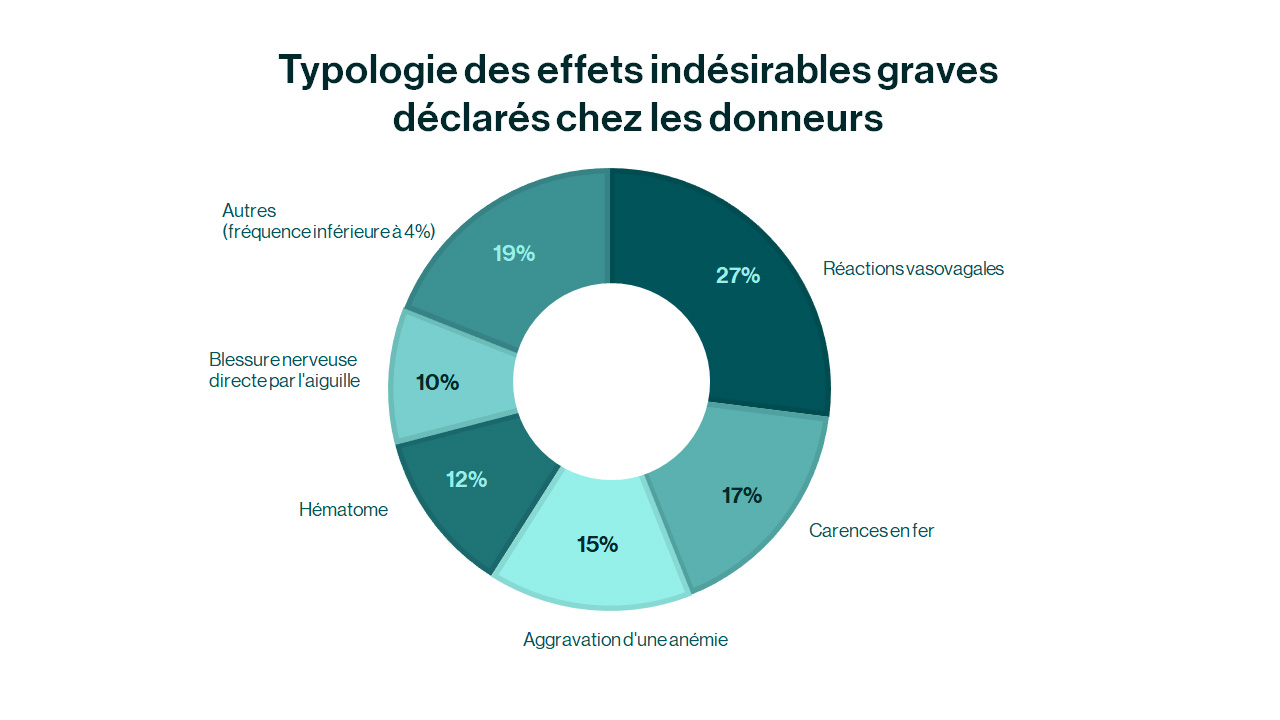 En 2024, 115 effets indésirables graves fortement imputables au don ont été déclarés au système d’hémovigilance pour 1 557 675 donneurs.Les effets indésirables graves donneurs (EIGD) sont majoritairement des malaises vagaux (réactions vasovagales), des carences en fer ou encore des aggravations d’une anémie. Dans la majorité des cas, ces EIGD sont sans conséquence pour le donneur ou ont entraîné des arrêts de travail de courte durée.