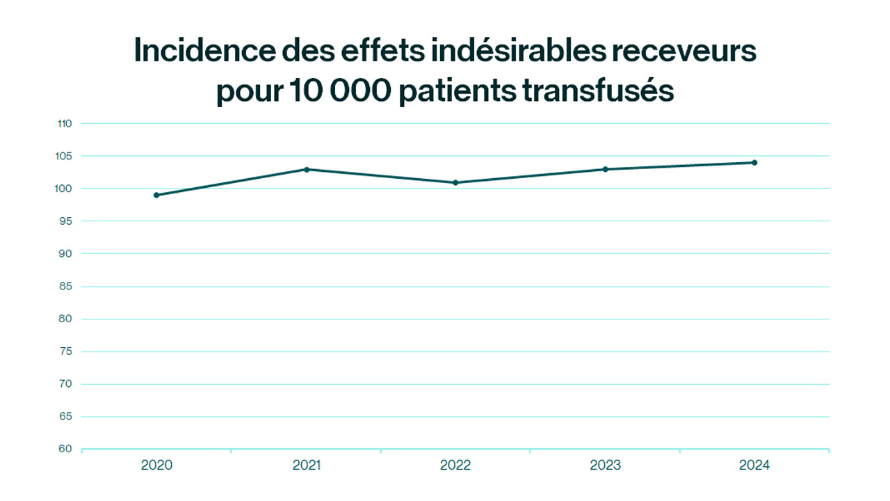 En 2024, 520 872 patients ont été transfusés. Ces transfusions ont donné lieu à la déclaration de 5 431 effets indésirables fortement imputables à la transfusion, en augmentation de 0,4 %.Pour les receveurs, 92 % des effets indésirables fortement imputables à la transfusion sont « non sévères ». Ce sont essentiellement, par ordre de fréquence, des allo-immunisations isolées (dont 99 % de grade 1, la gravité la plus faible), des allergies (dont 73,6 % de grade 1), des réactions fébriles non hémolytiques (dont 97,6 % de grade 1). Les effets indésirables graves (grade 2 à 4) représentent 8 % des effets indésirables imputables à la transfusion. Ce sont essentiellement des effets indésirables connus (allergie, œdème pulmonaire de surcharge, hémolyse retardée chez le drépanocytaire, etc.).