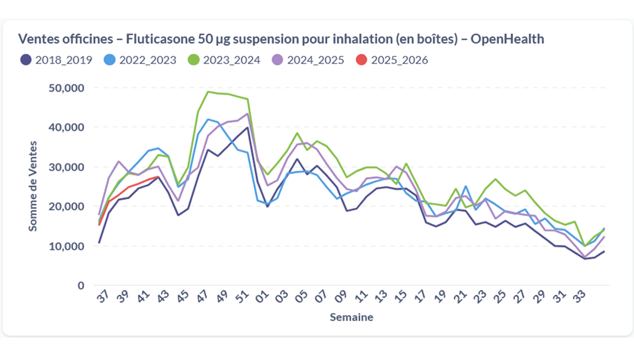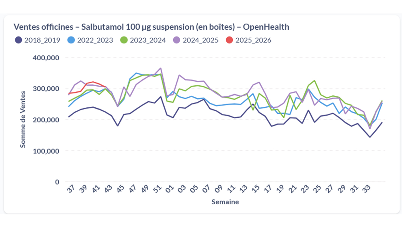 (source : données extrapolées à partir d'un panel d'environ 14 000 pharmacies de ville OpenHealth)Ces graphiques présentent, pour chaque groupe de molécules sentinelles, le nombre hebdomadaire de dispensations, en boîtes, extrapolées à partir d'un panel de 14 000 pharmacies de ville réparties sur le territoire durant les années 2024-2025, 2023-2024, 2022-2023 et 2018-2019 et l'année en cours.