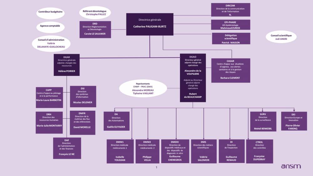 La directrice ou le directeur général de l'ANSM s’appuie dans ses missions sur une direction générale adjointe en charge des opérations (DGAO) et une direction générale adjointe chargée des ressources (DGAR). Lui sont également rattachés la direction réglementation et déontologie, la direction de la communication et de l’information, la délégation scientifique et le GIS EPI-PHARE.