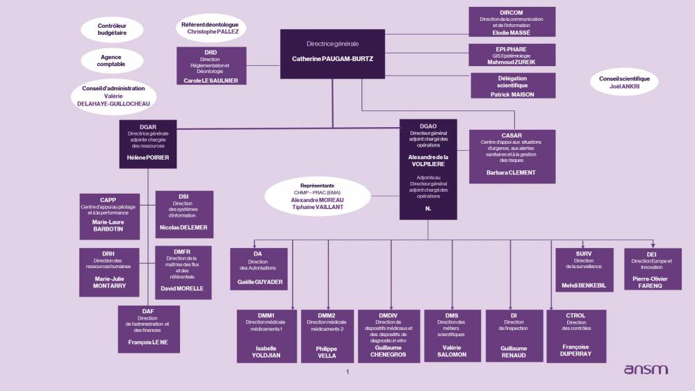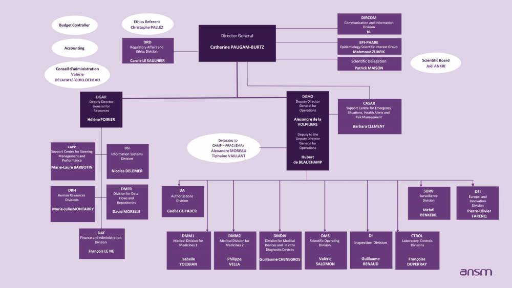 The Director General of ANSM is assisted in her duties by a Deputy Directorate-General for Operations (DGAO) and a Deputy Directorate-General for Resources (DGAR). The Regulatory Affairs and Ethics Division, the Communication and Information Division, the Scientific Delegation, and the EPI-PHARE Scientific Interest Group also report to the Director General.