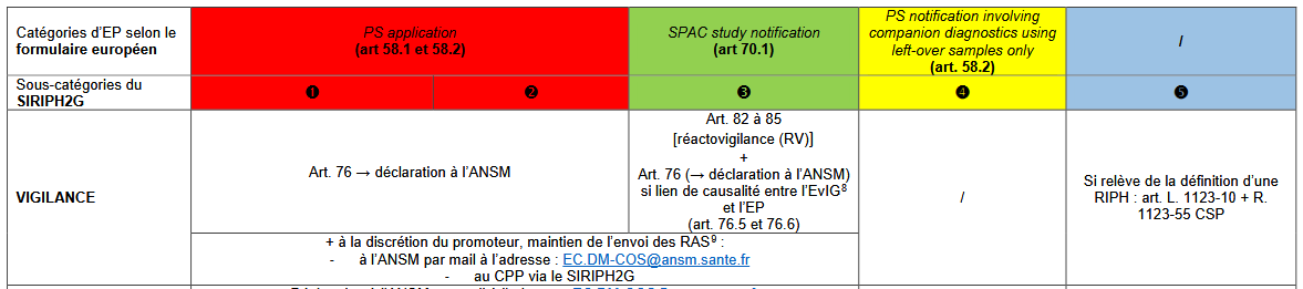 Dans l'attente de l'avis aux promoteurs en cours de rédaction, l’ANSM leur recommande de s’appuyer sur les ressources suivantes pour encadrer leurs pratiques en matière de signalement des événements indésirables, incidents techniques ou écarts :- Tableau de classification des études des performances (EP) – Page 6 :